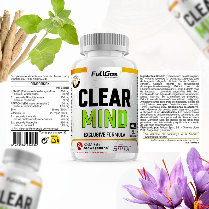 Clear Mind es un complemento alimenticio a base de extractos de plantas naturales, vitamina B6 y zinc para favorecer el control del estrés. Se trata de una formulación completa, creada por el dietista Ismael Galancho, y forma parte de la línea de salud de FullGas.
