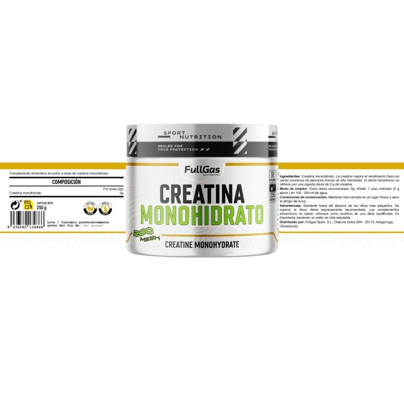 - Creatina monohidrato micronizada 200 mesh: excelente relación disolución-eficacia.