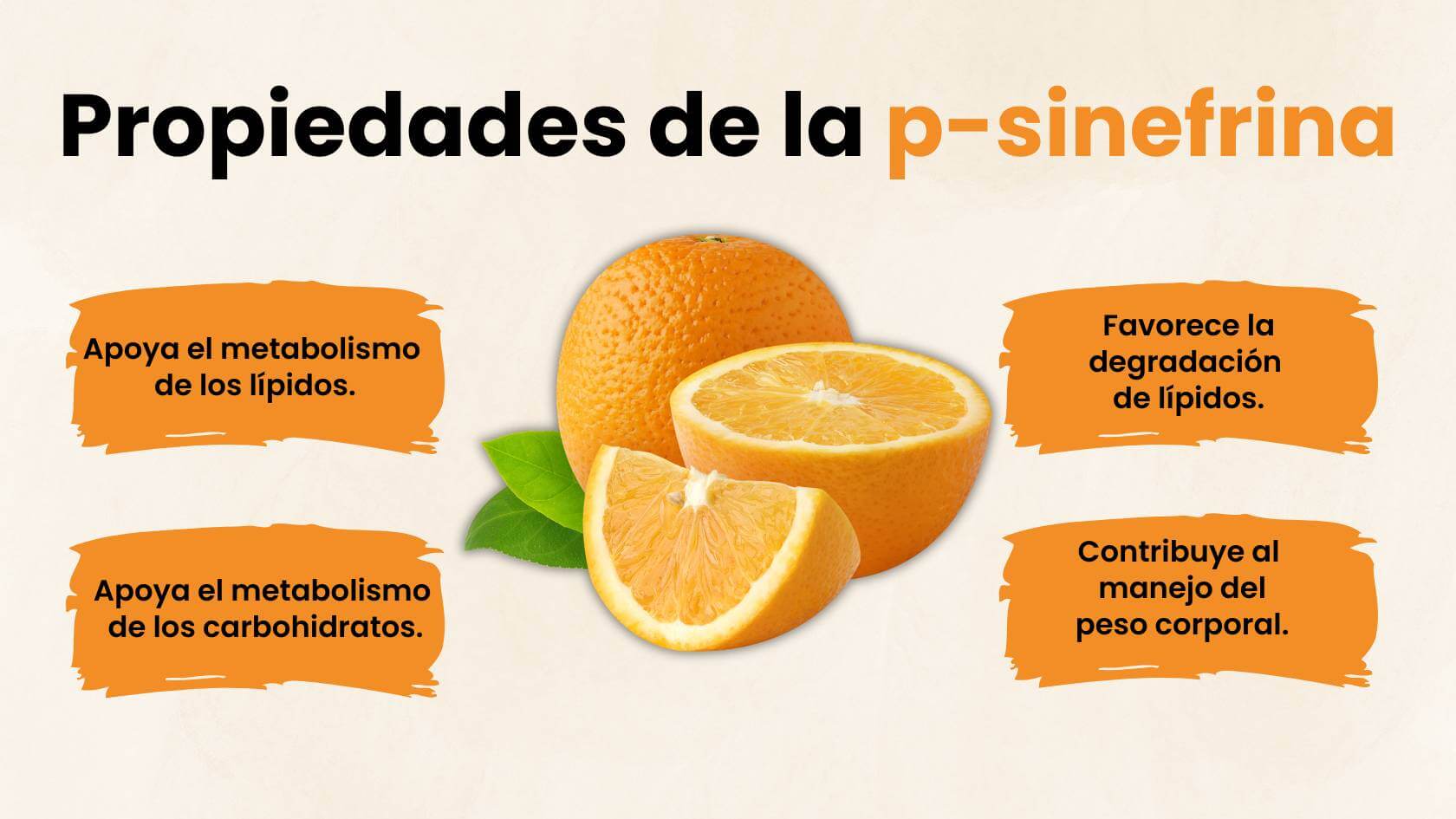 La sinefrina es un alcaloide presente de forma natural en cítricos como la naranja amarga y se encuentra en distintas formas isoméricas: orto (o-), meta (m-) y para (p-), cada una con propiedades fisiológicas diferenciadas. De estas, solo la p-sinefrina está naturalmente presente en los frutos y reconocida por su seguridad y eficacia.
