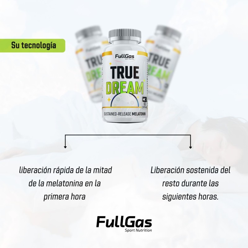 Para abordar este problema, la solución podría ser la combinación de una melatonina de liberación rápida y otra de liberación lenta. Pero eso es algo que no garantiza una liberación de melatonina que se adapte al ritmo circadiano del sueño. Por tanto, no hemos unido melatonina rápida y melatonina lenta en este complemento alimenticio, lo que hemos formulado en True Dream es una melatonina especial patentada que se libera un 50% primero rápidamente y luego el otro 50% se va liberando poco a poco hasta las 8 horas.