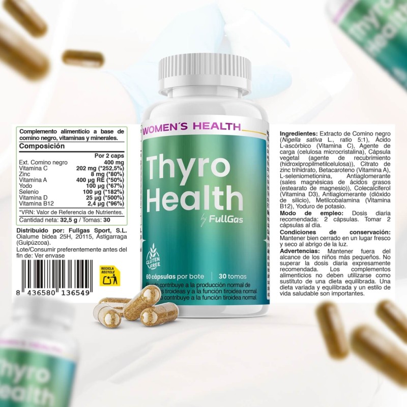 ThyroHealth es un complemento alimenticio formulado con una combinación de minerales, vitaminas y extracto de comino negro. Su contenido en yodo y selenio contribuyen la producción normal de hormonas tiroideas (yodo) y el funcionamiento normal de la tiroides (yodo y selenio).