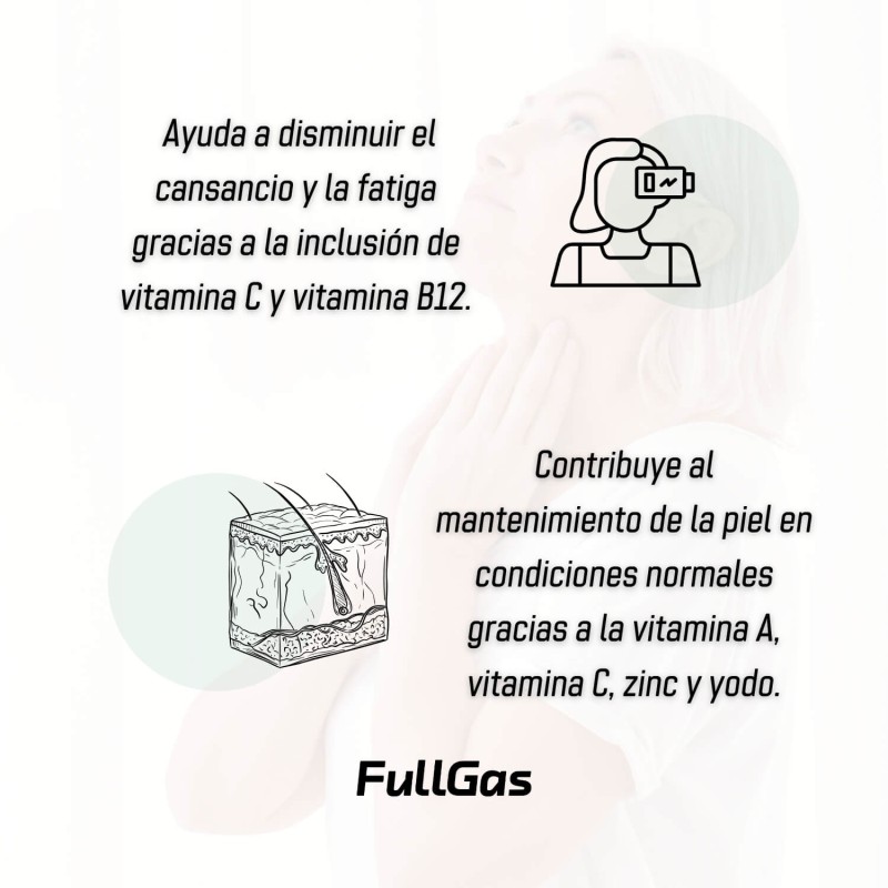 - Contribuye al mantenimiento de la piel en condiciones normales gracias a la vitamina A, vitamina C, zinc y yodo.
