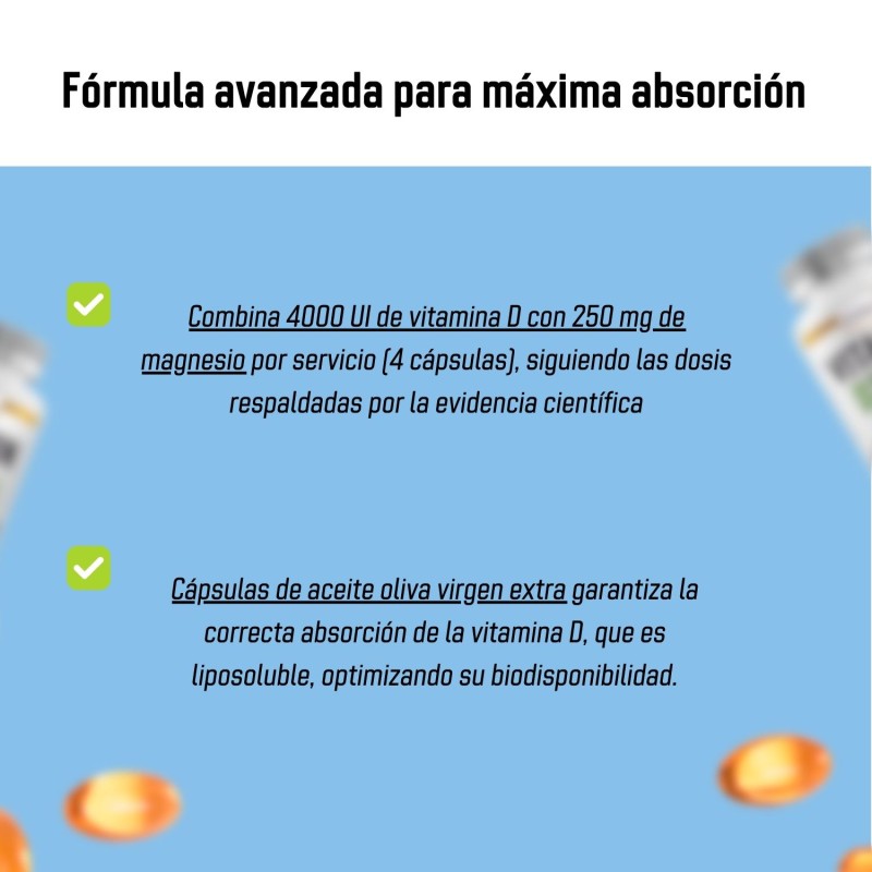 - Formulación de vitamina D3 y magnesio diseñada para una perfecta absorción gracias a las cápsulas en aceite de oliva virgen extra.